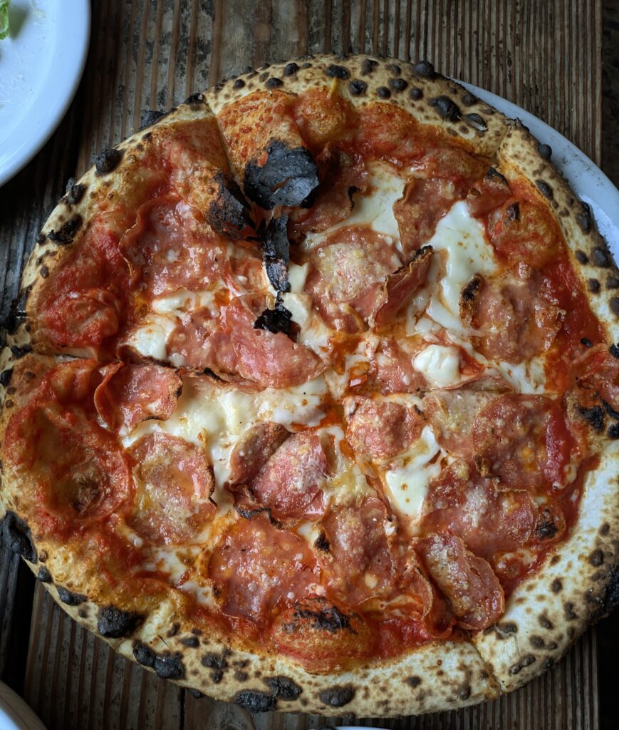 At Benchmark Pizzeria, the focus is on crafting exceptional pizzas with a distinctive neo-Neapolitan style. The dough undergoes a meticulous 48-hour fermentation process, resulting in a crust that is both blistered and sturdy, with a rich flavor and satisfying chewiness. This dedication to dough craftsmanship reflects Peter Swanson’s deep expertise and experimentation, as he has refined his recipe through dozens of iterations, maintaining the original starter he developed at home. The pizzas are thin-crust, light on cheese and toppings, and served whole to preserve the integrity of the ingredients, inviting diners to enjoy them in a more authentic, hands-on manner.