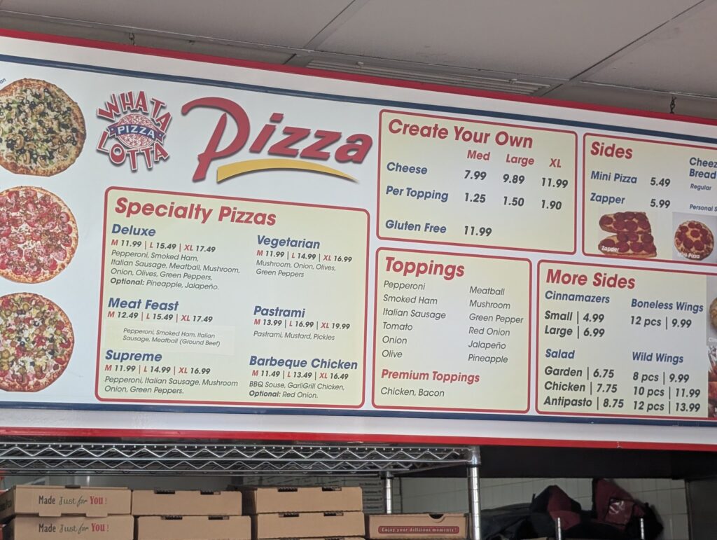 At Whata Lotta Pizza, the focus is on delivering the best-tasting pizzas at the lowest possible price, without ever compromising on quality. Every pie is made with only the finest ingredients, ensuring a consistent and satisfying experience with every bite. Whether you’re in the mood for a traditional pepperoni, a veggie-loaded masterpiece, or a specialty pie with a creative twist, the menu offers something for everyone. Beyond pizza, Whata Lotta Pizza also serves a variety of wings, perfect for sharing or enjoying as a snack, making it an ideal spot for families, friends, or anyone looking for a casual meal. The low-key setting invites guests to relax and savor their food, whether dining in or taking it to go.